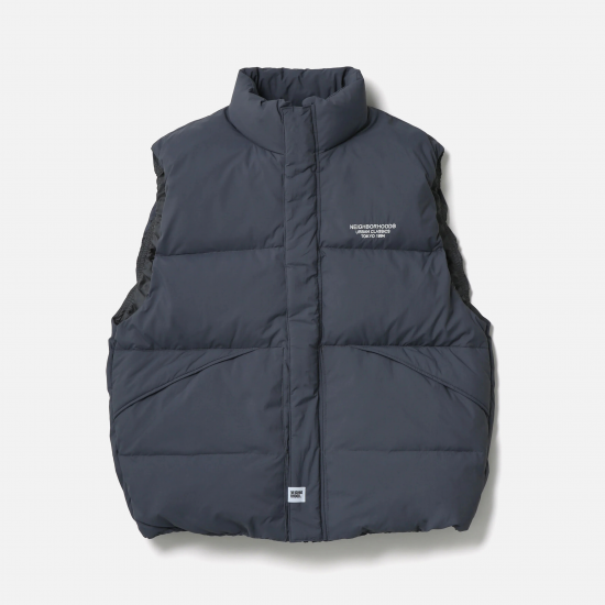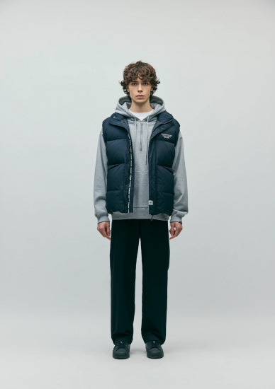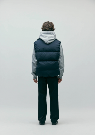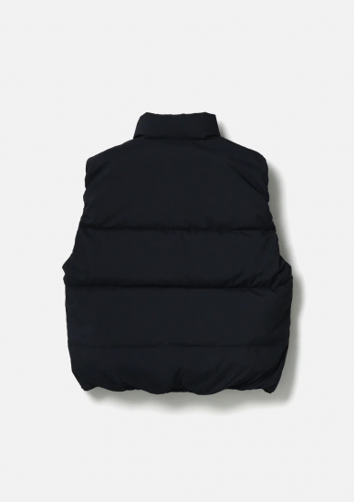軽量でマットな質感のナイロンタスランタフタ素材を使用したダウンベスト。
