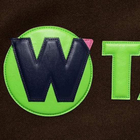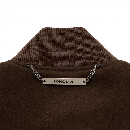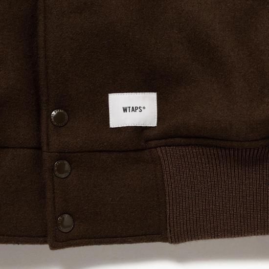 ウール/ポリエステル混紡のメルトン生地に、袖をシンセティックレザーで切り替えたバーシティジャケット。