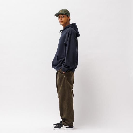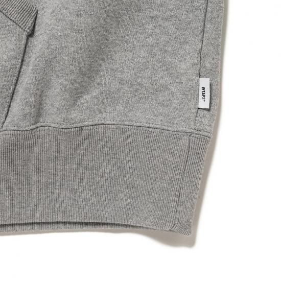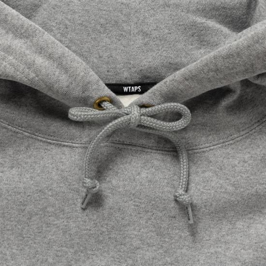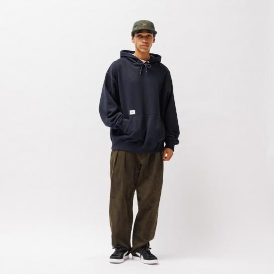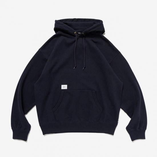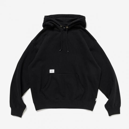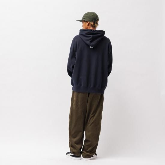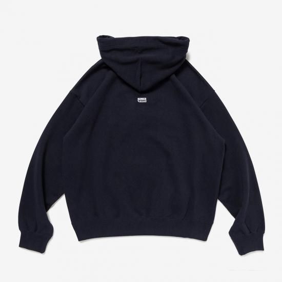 裏毛起毛生地を使用したプルオーバーフーディー。バックに刺繍モチーフを配置。