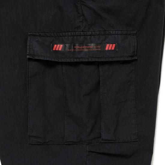 アコーディオン型のカーゴポケット右側に両端の斜線でサイズを表記するプリントネームを付属。