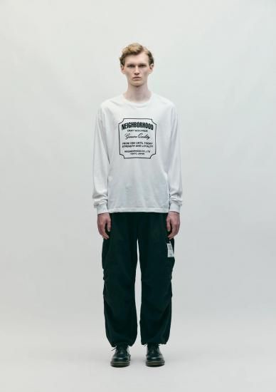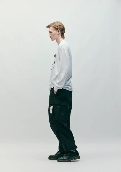 ポケット脇にピスネームを付属。膝元にタックを施したゆとりのあるシルエット。
